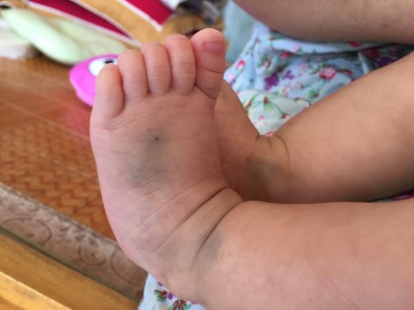 Trên cơ thể bé nhỏ là chi chít những vết thâm đen do tiêm thuốc và vết xuất huyết