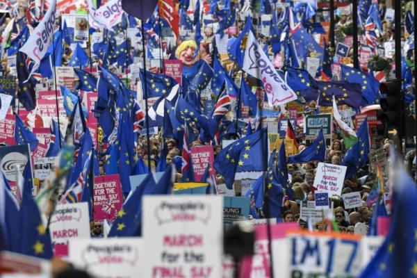 Hàng chục ngàn người biểu tình ủng hộ EU từ khắp nước Anh cầm các biểu ngữ, bảng hiệu và cờ tập trung trước tòa nhà quốc hội đã reo hò khi các nghị sĩ buộc chính phủ phải yêu cầu Brussels trì hoãn Brexit.