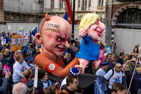 Những người biểu tình đã mang theo một hình nộm mô tả Johnson là một con rối được điều hành bởi cố vấn trưởng của ông Dominic Cummings - một nhân vật gây chia rẽ, người chủ mưu trong chiến dịch thành công năm 2016 rời khỏi EU.