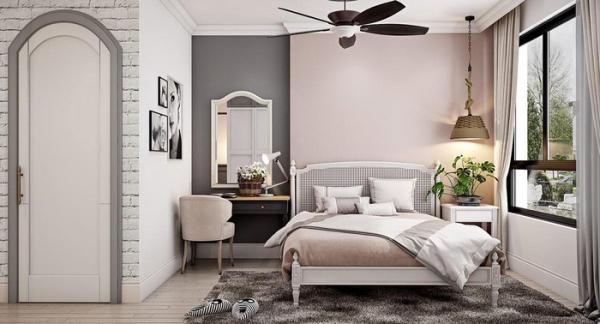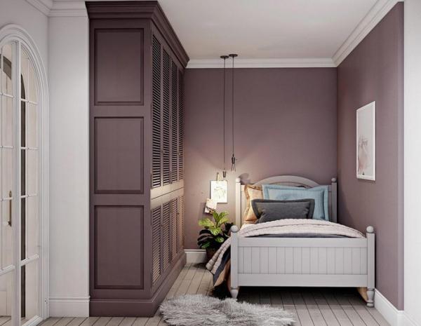 Phòng ngủ thứ hai trang trí bằng màu tím, mang đến cảm giác ấm cúng, gần gũi.
