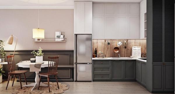 Cuối căn phòng là một nhà bếp hình chữ L gọn gàng, để chủ nhân căn hộ có thể trổ tài nấu nướng.