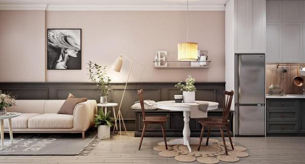 Một tấm thảm tách khu vực tiếp khách so với những căn phòng khác mà không cần phải dùng đến tường ngăn. Chiếc ghế sofa màu hồng nhạt mang đến cảm giác nhẹ nhàng và dễ chịu.