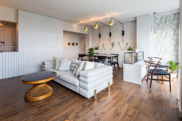 Nền gỗ tạo nên sự liên kết đặc biệt giữa khu vực tiếp khách với phòng ăn.