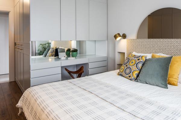 Tận dụng phần ngăn cách giữa hai chiếc tủ, chủ nhân bố trí một chiếc bàn trang điểm nhỏ để sử dụng hàng ngày.