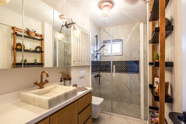 Bức tường kính giữ cho khu vực vệ sinh cá nhân luôn khô ráo. Bồn rửa tay bằng đá trở thành điểm nhấn hút mắt cho khu vực phòng tắm.