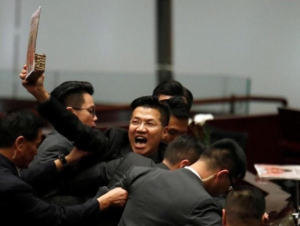 Hàng chục nghị sĩ la ó đồng thời cầm biểu ngữ chỉ trích đặc khu trưởng ngay tại phòng họp trước khi bị nhân viên an ninh mời ra ngoài. Bà Lâm giữ im lặng chứ không phản ứng lại.