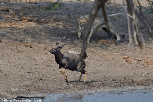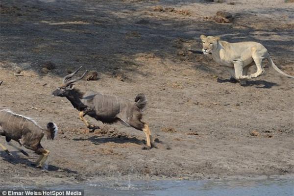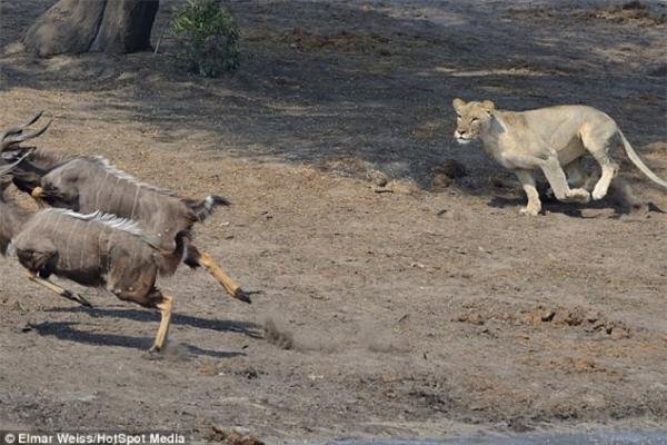 Con linh dương đực nhận thấy nguy hiểm ngay lập tức bỏ chạy khỏi con sư tử hung dữ. (Nguồn: Daily Mail)