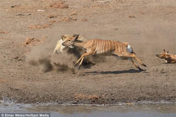 Sư tử đói lao tới vồ một con linh dương nhỏ từ phía sau, con linh dương tội nghiệp bị đàn của nó bỏ lại sau. (Nguồn: Daily Mail)