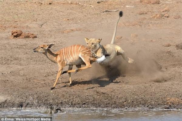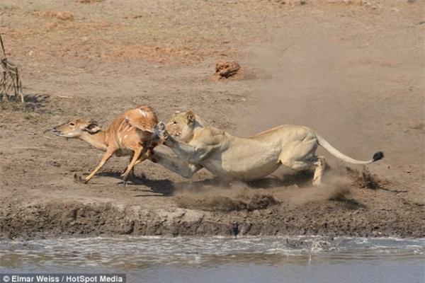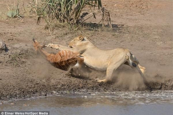 Sư tử dễ dàng hạ gục con mồi ngay bên cạnh hố nước. (Nguồn: Daily Mail)