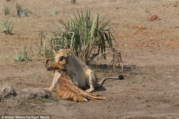 Sư tử thưởng thức bữa trưa thịnh soạn với một con linh dương nyala còn non. (Nguồn: Daily Mail)