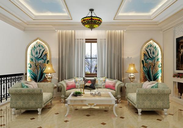 Ghế sofa, tranh treo tường, màn cửa, trần thạch cao sắp xếp đối xứng tăng hiệu quả về mặt thị giác.