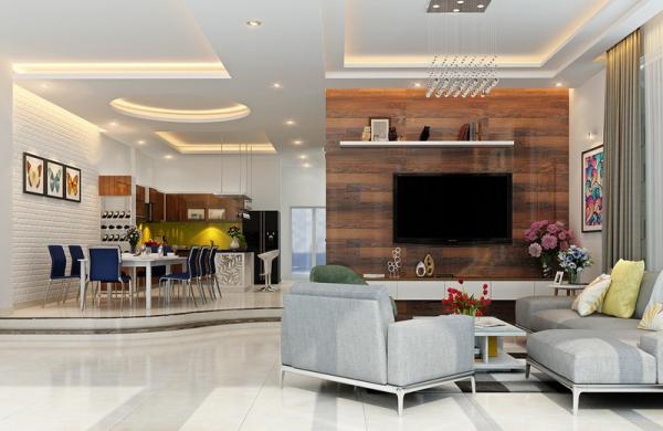 Sàn giật cấp phân chia phòng ăn với phòng khách hiệu quả.