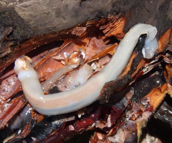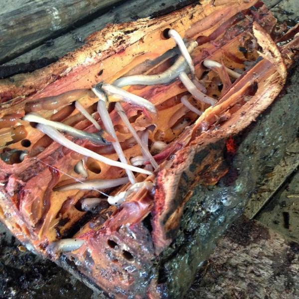 Lúc nhúc ở các lỗ bên trong thân cây mục nát, nhiều con tamilok có thể dài 30-50 cm. Chúng phát triển mạnh ở vùng nước mặn và thức ăn duy nhất là gỗ. Loài sinh vật này chết ngay khi tiếp xúc với không khí. Ảnh: Anthonette Clerigo.