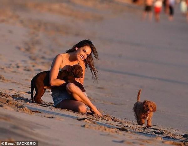 Alessandra Ambrosio ôm thú cưng ra biển đi dạo.