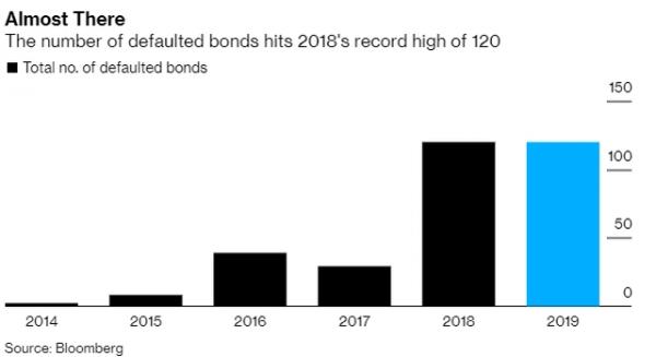 Tổng số vỡ nợ trái phiếu của các công ty nội địa Trung Quốc mặc định tính tới thời điểm này trong năm nay đã bằng với kỷ lục được thiết lập cho cả năm 2018.