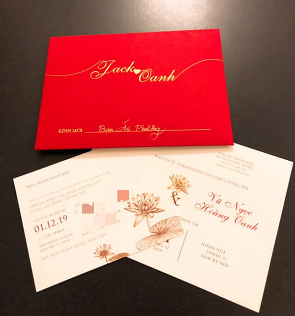 Thiệp cưới Hoàng Oanh được ca sĩ Ái Phương đăng tải.