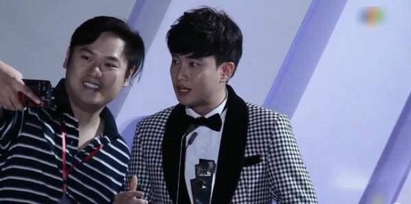 Trước đó, Quốc Trường đã bị một người đàn ông lạ mặt làm phiền khi đang phát biểu cảm nghĩ. Được biết, trong lúc xúc động chia sẻ tâm trạng, một nhân viên sản xuất bất ngờ lao lên sân khấu và xin chụp ảnh cùng nam diễn viên.