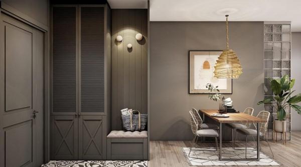 Góc tường được tận dụng để đặt tủ đựng giày và một chiếc ghế ngồi nghỉ.