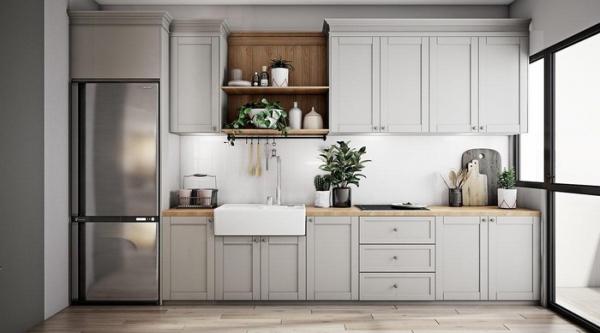 Tủ bếp màu xám nằm tách biệt với phòng khách và phòng ăn, nhận ánh sáng chiếu qua một khung cửa kính lớn.