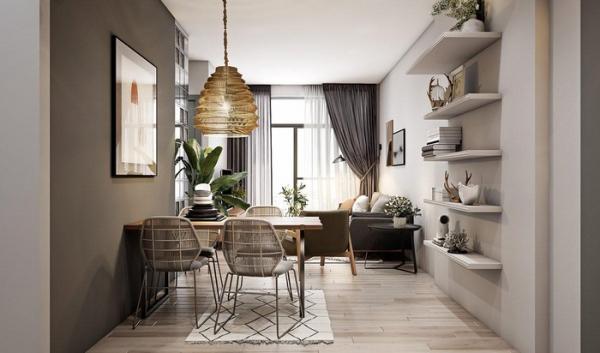Bàn ăn làm từ gỗ tự nhiên kết hợp với đèn mặt dây chuyền làm theo phương pháp thủ công, thể hiện sự đầu tư cho căn hộ của người sở hữu.