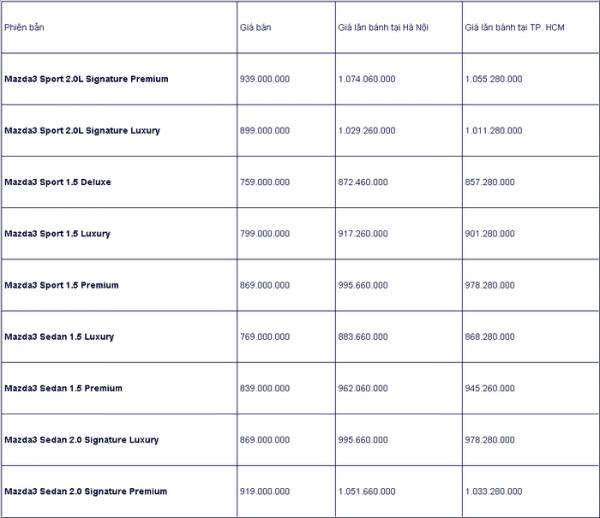 Theo công bố của nhà phân phối Thaco Trường Hải, giá bán của Mazda3 Sport mới dao động từ 759 đến 939 triệu đồng, còn mẫu Mazda3 sedan có giá bán từ 719 đến 919 triệu đồng.