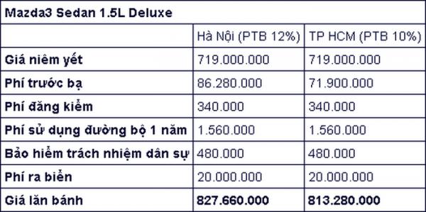 Dưới đây là bảng giá lăn bánh của Mazda3 hoàn toàn mới bản sedan 1.5L Deluxe:
