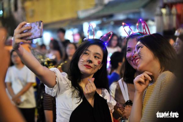 Các bạn trẻ, trong đó có cả các du khách nước ngoài, cùng nhau đổ ra đường, khoác lên mình những bộ trang phục siêu đặc biệt chẳng đụng hàng ai và không quên họa mặt đặc sắc.