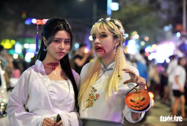 Hai bạn trẻ dễ thương Mỹ Trân và Minh Kỳ cùng hòa vào dòng người tham gia lễ hội Halloween tại phố đi bộ Bùi viện - Ảnh: DUYÊN PHAN