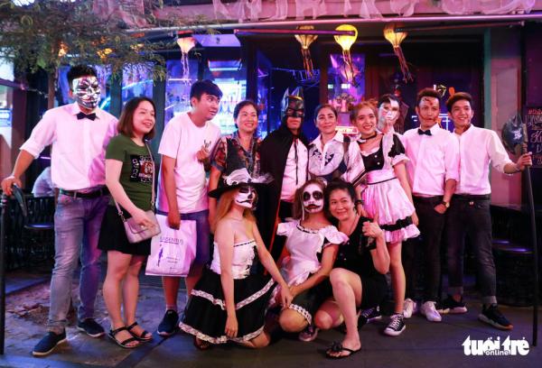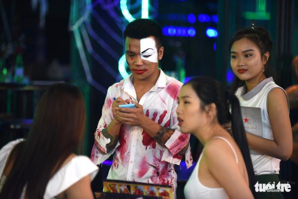 Các hàng quán cho nhân viên hóa trang thành các nhân vật rùng rợn để thu hút khách hàng - Ảnh: NGỌC PHƯỢNG