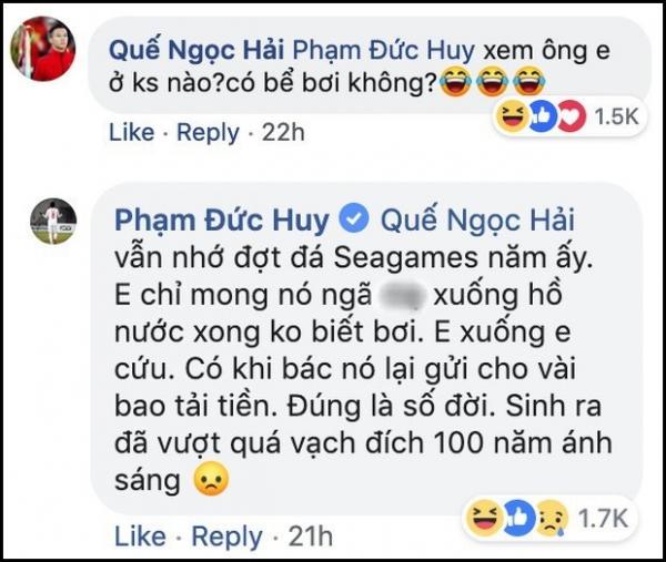 Trong một bài đăng nói về sự giàu có của Hoàng tử Brunei tại thời điểm đó, trung vệ Quế Ngọc Hải bình luận với Đức Huy: “Xem ông em ở khách sạn nào? Có bể bơi không”. Nhiều người chưa hiểu Quế Ngọc Hải đang bình luận về điều gì thì Đức Huy lập tức trả lời đàn anh kể về kỷ niệm: “Vẫn nhớ đợt đá sea games năm ấy. Em chỉ mong nó ngã xuống hồ nước xong không biết bơi. Em xuống em cứu, có khi bác nó lại gửi cho vài bao tải tiền“.