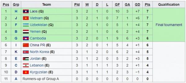 Xếp hạng các đội nhì bảng (bảng A chưa thi đấu) vòng loại U19 châu Á 2020