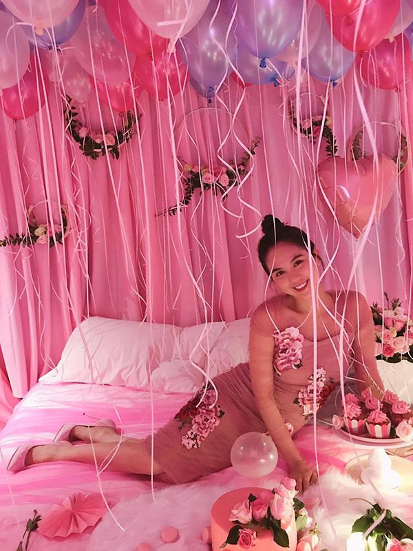 Mỹ nhân "Vòng eo 56" khoe căn phòng ngập tràn sắc hồng và bó hoa khổng lồ được bạn trai tặng. Chân dài chia sẻ: "Khi bước vào căn phòng này mình đã khóc, có lẽ anh biết dạo này mình thích màu hồng nên đã chịu khó làm cho mình một căn phòng hồng toàn tập. Tất cả những gì anh làm cũng chỉ muốn mình được thật sự vui vẻ và hạnh phúc nhất, điều mà mình chưa bao giờ có được trong 29 năm qua. Cám ơn anh vì tất cả. Một sinh nhật đáng nhớ và ý nghĩa nhất, khiến mình vui và xúc động nhất".