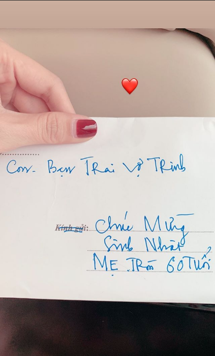 Không chỉ yêu chiều Ngọc trinh, người tình lớn tuổi cũng tỏ ra tâm lý với đấng sinh thành của chân dài. Trong chuyến trở về quê hương Trà Vinh mới đây, Ngọc trinh khoe 2 phong bì mà người yêu gửi cho ba mẹ. Không chỉ trao tặng món quà vật chật, vị đại gia còn chu đáo ghi ngoài phong bì lời nhắn đầy tình cảm: "Con - Bạn trai vợ trinh: Chúc mừng sinh nhật mẹ tròn 60 tuổi"; "Con - Bạn trai vợ trinh: Chúc mừng sinh nhật ba". Có thể thấy mối quan hệ của mỹ nhân họ trần và bạn trai rất khăng khít, họ xưng hô "vợ - chồng" đầy ngọt ngào.