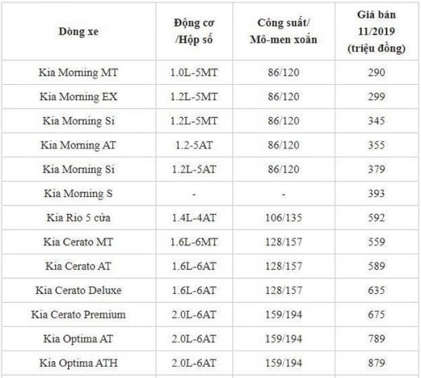 Dưới đây là bảng giá các mẫu xe ô tô KIA cập nhật cuối tháng 11/2019 tại thị trường Việt Nam: