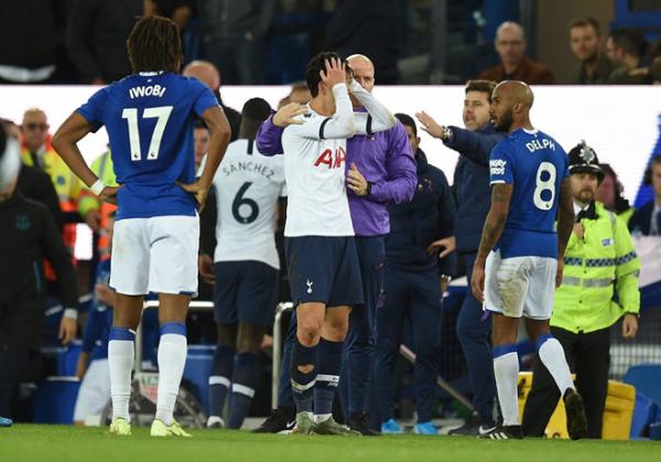 Son Heung-min (áo trắng) và các cầu thủ Everton bàng hoàng khi chứng kiến chấn thương của Gomes