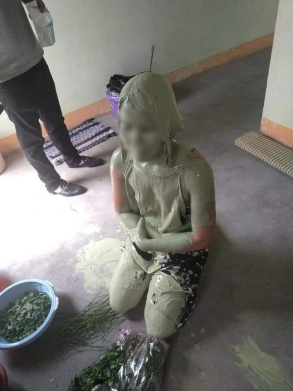 Hình ảnh người phụ nữ quỳ gối dưới nền nhà và bị tạt sơn được chia sẻ với dòng trạng thái “chỉ vì lỡ yêu phải chồng người khác thôi mà“.
