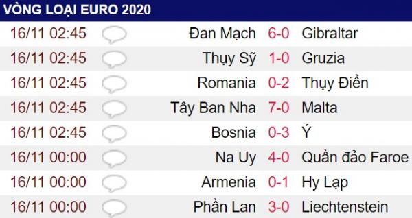 Kết quả chi tiết loạt trận rạng sáng 16/11 vòng loại EURO 2020.