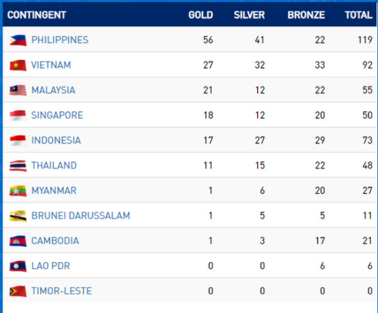 Kết thúc ngày thi đấu thứ 4, đoàn TTVN giành thêm 4 HCV, 7 HCB và 9 HCĐ để nâng tổng số huy chương lên thành 27 HCV, 32 HCB và 34 HCĐ. Chủ nhà Philippines vẫn đang đứng đầu bảng tổng sắp huy chương với thành tích 56 HCV - 41 HCB - 22 HCĐ. Sau 4 ngày thi đấu chính thức đầu tiên, Timor Leste là đoàn duy nhất vẫn chưa giành được tấm huy chương nào tại sea games 30.