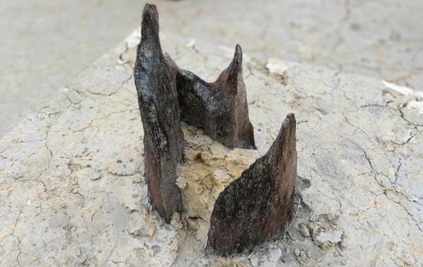 Các cọc xuất lộ bị gãy phần đầu, gỗ màu đỏ sẫm, rắn chắc. Ảnh: L.T.
