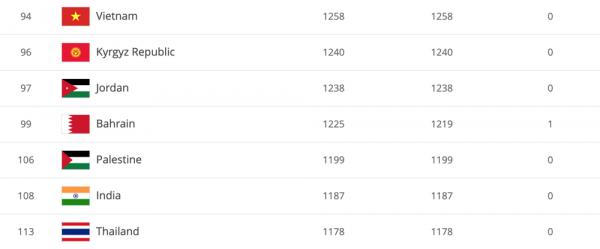 Với thứ hạng này, ĐT Việt Nam tiếp tục bỏ xa "đại kình địch" tại Đông Nam Á là ĐT Thái Lan với khoảng cách 19 bậc. Hiện tại, đoàn quân của HLV Akira Nishino đang đứng ở vị trí 113 thế giới.