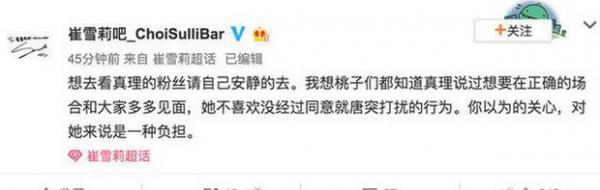 Tuy nhiên, mới đây một fanclub lớn của Sulli ở Trung Quốc đã bất ngờ đăng tải bài viết bày tỏ sự phẫn nộ về hành động vô ý thức, thiếu tôn trọng người đã khuất của một số người trước ngôi mộ Sulli.