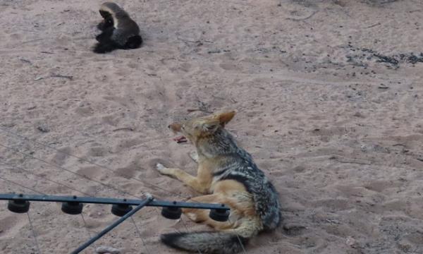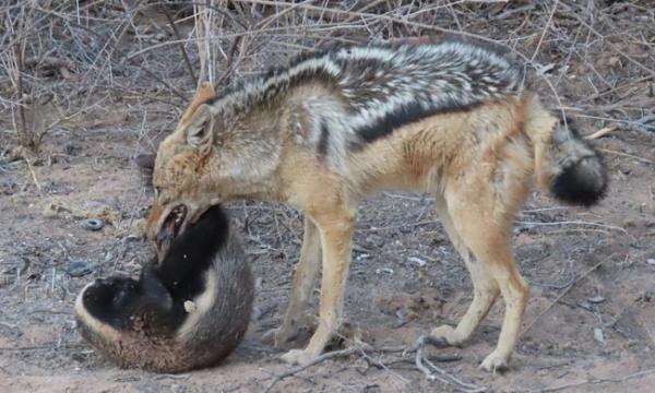Sự lỳ lợm và dai sức đã giúp lửng mật giành phần thắng khi chó rừng lưng đen chạy tới tranh xác sóc đất.