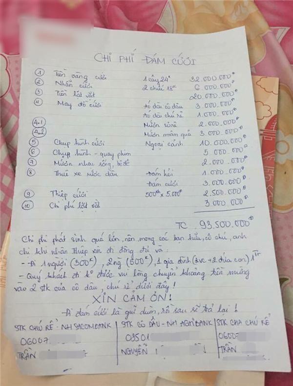 Ấy vậy mà mới đây em có đọc được bài viết của một chú rể đăng đàn trên mạng xã hội thông báo chi tiết về các khoản chi phí chuẩn bị cho đám cưới. Mục đích chính là nhắc nhở các vị khách đi quà mừng cho "đúng quy định". Cụ thể như sau: