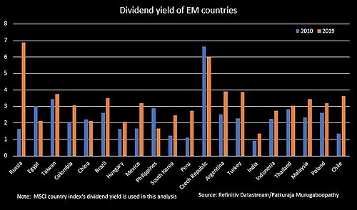 Nga và Cezch dẫn đầu về tỷ lệ chi trả cổ tức, trong khi Ấn Độ có tỷ suất sinh lợi thấp nhất. Cổ tức của Nga tăng lên 6,8% vào cuối tháng 11/2019, so với mức 1,6% vào đầu năm 2010. Tỷ lệ cổ tức của Chile cũng tăng lên 3,6, từ mức 1,3%.