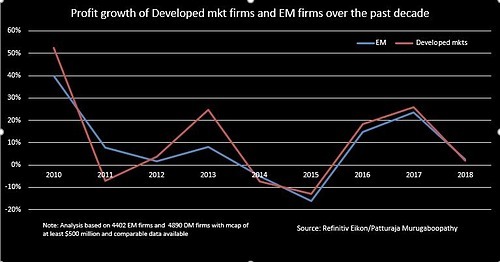 phân tích cũng cho thấy tăng trưởng lợi nhuận của các công ty thị trường mới nổi tụt lại so với các công ty thị trường phát triển trong phần lớn thập kỷ qua.