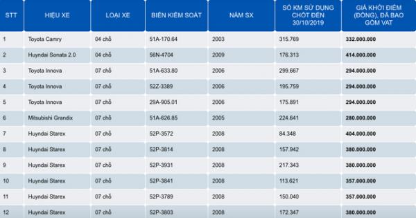 Một lô xe ô tô gồm 20 chiếc từ 4 đến 7 chỗ mới đây được một ngân hàng rao bán thanh lý với tổng giá trị lên tới 6,2 tỷ đồng. Trong số này, chiếc Toyota Camry 2003 có giá khởi điểm lên tới 332 triệu đồng, Hyundai Sonata 2.0 đời 2009 giá 414 triệu, Toyota Innova đời 2006 có giá bán từ 294 triệu đồng.