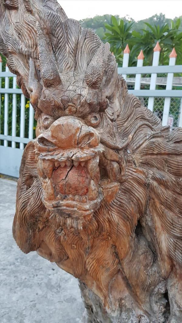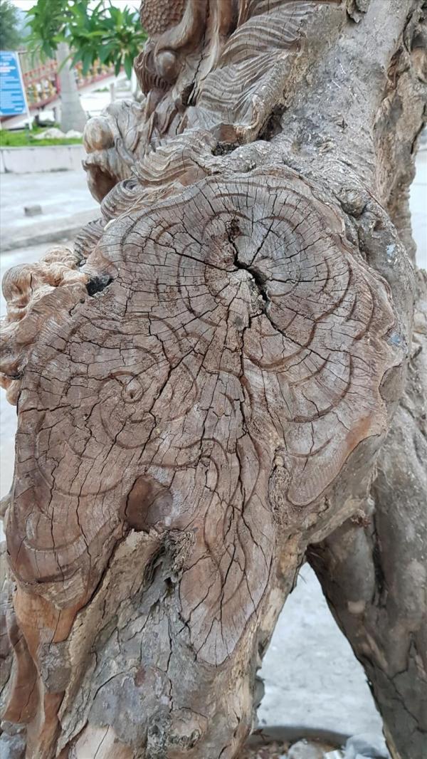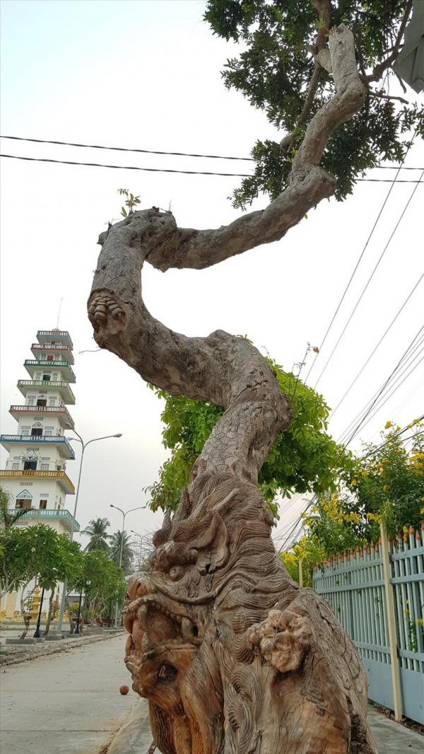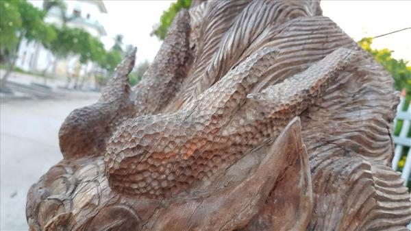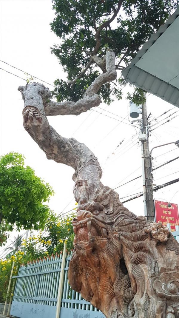 Phần thân cây gồ lên có hình gương mặt rồng ngậm ngọc. Toàn bộ "cấu trúc" gồ ghề này đều là do thân cây được gọt khéo léo mà thành. Các đám mây bay lượn, trán rồng, sừng của rồng, rồi móng vuốt vân vi đều là gỗ sẵn có và vẫn có nhựa tươi rói của một cái cây đang sống, đang lớn lên từng ngày. Không có thêm bất cứ vật liệu nào khác "bị" đưa vào.