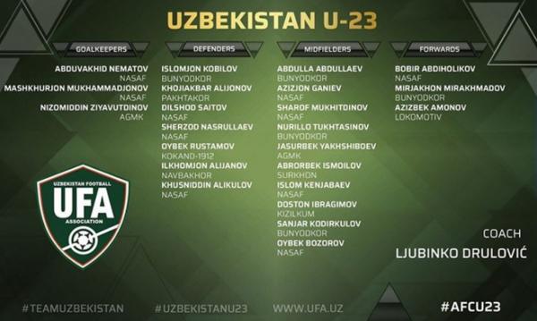 Ngày 27/12, HLV Ljubinko Drulovic đã chốt danh sách 23 cầu thủ Uzbekistan tham dự vòng chung kết U23 châu Á 2020.
