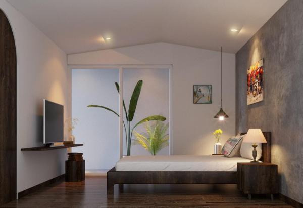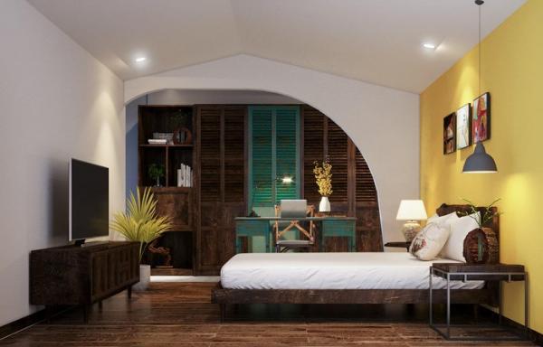 Phòng ngủ ấm cúng với đồ nội thất và kiểu mái vòm độc đáo.