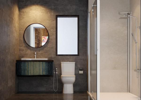 Phòng tắm có sự phân chia rõ ràng giữa gam màu tối và sáng.